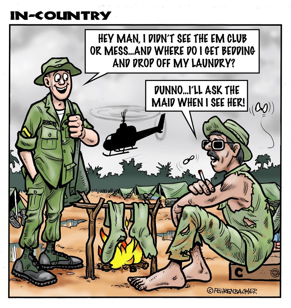 Phil enlisted in the Army in 1965 where he served for years in Vietnam.  He became a graphic designer and has worked for the state of Oregon for 26 years.  He retired in 2003 and started the Cartoon "In-Country".  The cartoons reflect his experiences during his tour of duty in South Vietnam.